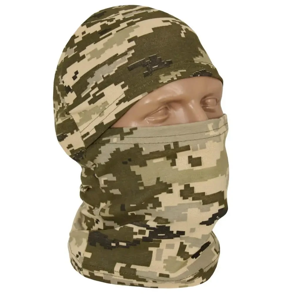 Балаклава маска виготовлена з бавовняного трикотажу. Матеріал приємний до тіла, м'який та простий у догляді. Внутрішні шви плоскі і створюють дискомфорту при тривалому носінні. Ця модель прикриває голову та шию, залишаючи відкритою тільки зону очей. Таку балаклаву можна використовувати як маску, шарф, шапку або підшоломник. Вироби такого роду популярні серед страйкболістів, військових, співробітників силових структур, мисливців та любителів походів. Колір балаклави – новий український камуфляж ММ-14. Зроблено цю модель в Україні.
